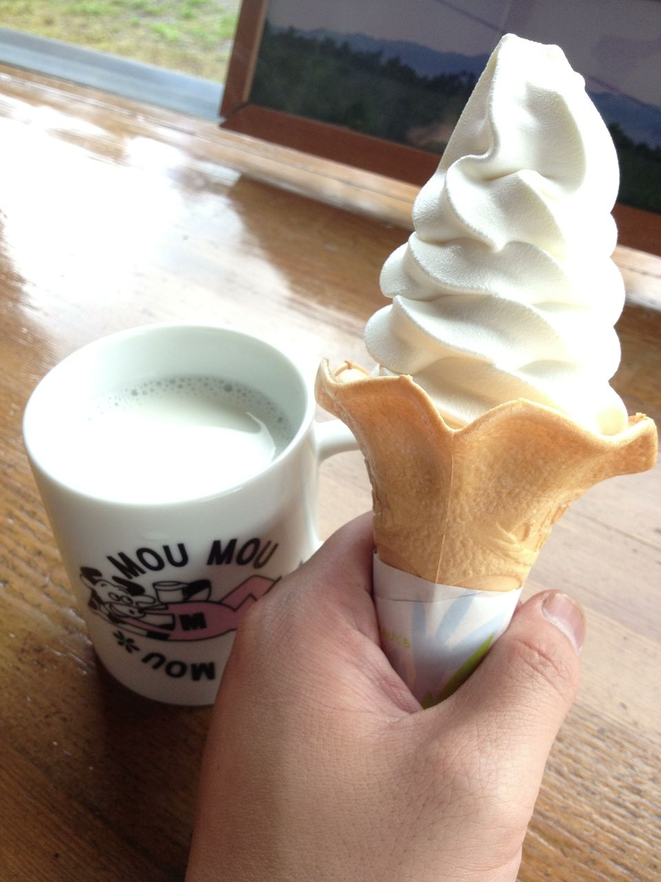 ホットミルクは案外さっぱりとしていて美味しく、アイスクリームはさすが牧場の味です。