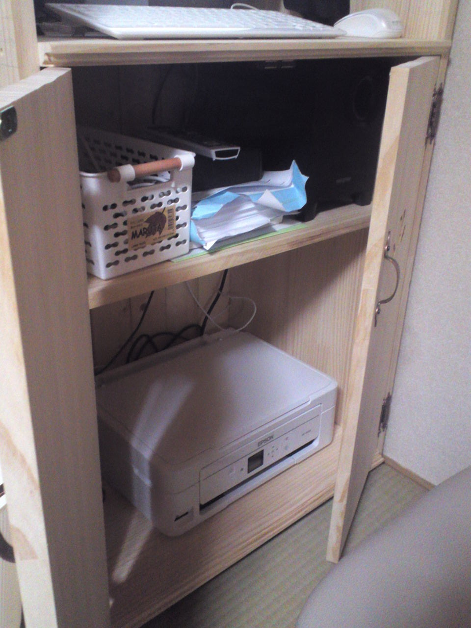 プリンターや配線、ちょっとしたPC小物やウーファーは扉の中に収納です。